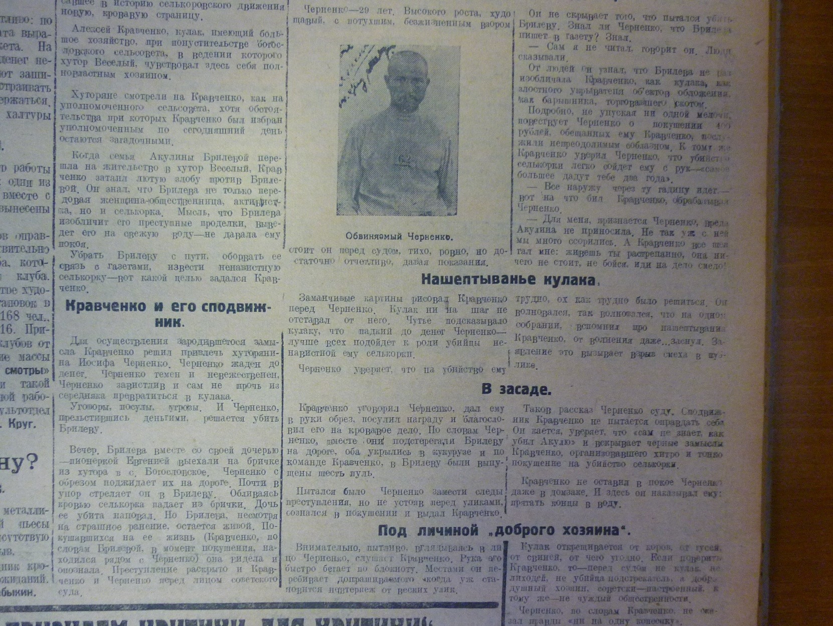 В этой статье почти за два месяца до судебного процесса нападение на Брилеву квалифицируется как «контрреволюционный акт против представителя советской власти и селькорки», подозреваемые Черненко и Кравченко называются преступниками. При этом наиболее тяжелым преступлением считается ранение Брилевой, а не убийство ее дочери: говорится о «зверской расправе» над селькором и о том, что весть о покушении, «сопровождавшемся убийством дочери», привлекла к себе внимание всех трудящихся города и станиц.