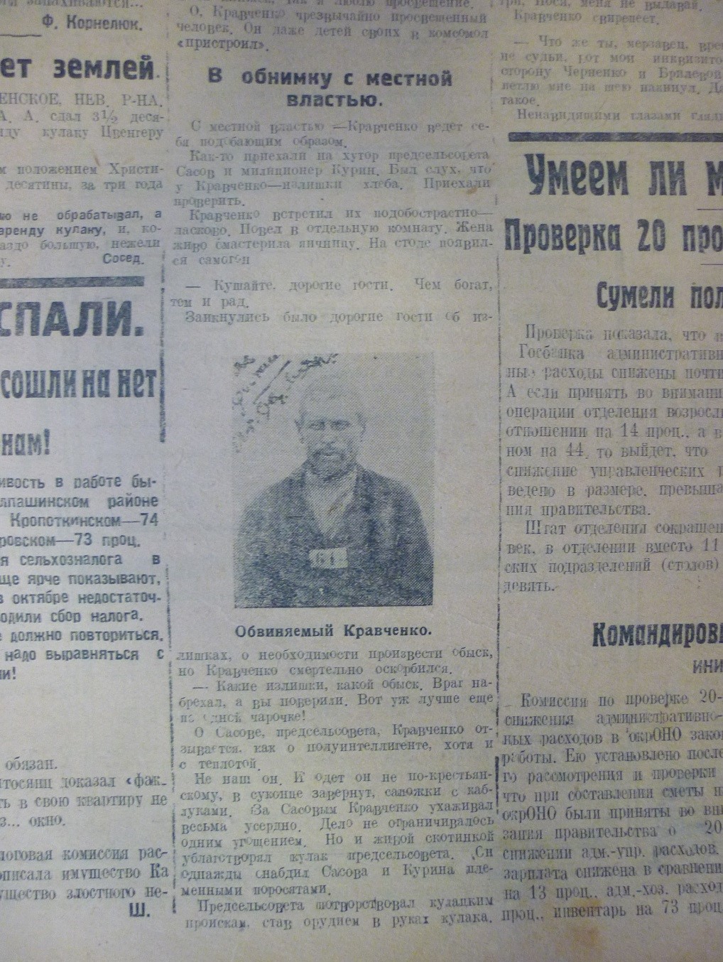 Здесь рассказывается о том, что Брилева, посылая в газету заметки о сельских непорядках, не обошла в них и «главного хуторского воротилу, кулака Кравченко. Этот Кравченко был уполномоченным хутора. Пользуясь административным положением, он безнаказанно спекулировал скотом, постоянно укрывал объекты обложения.