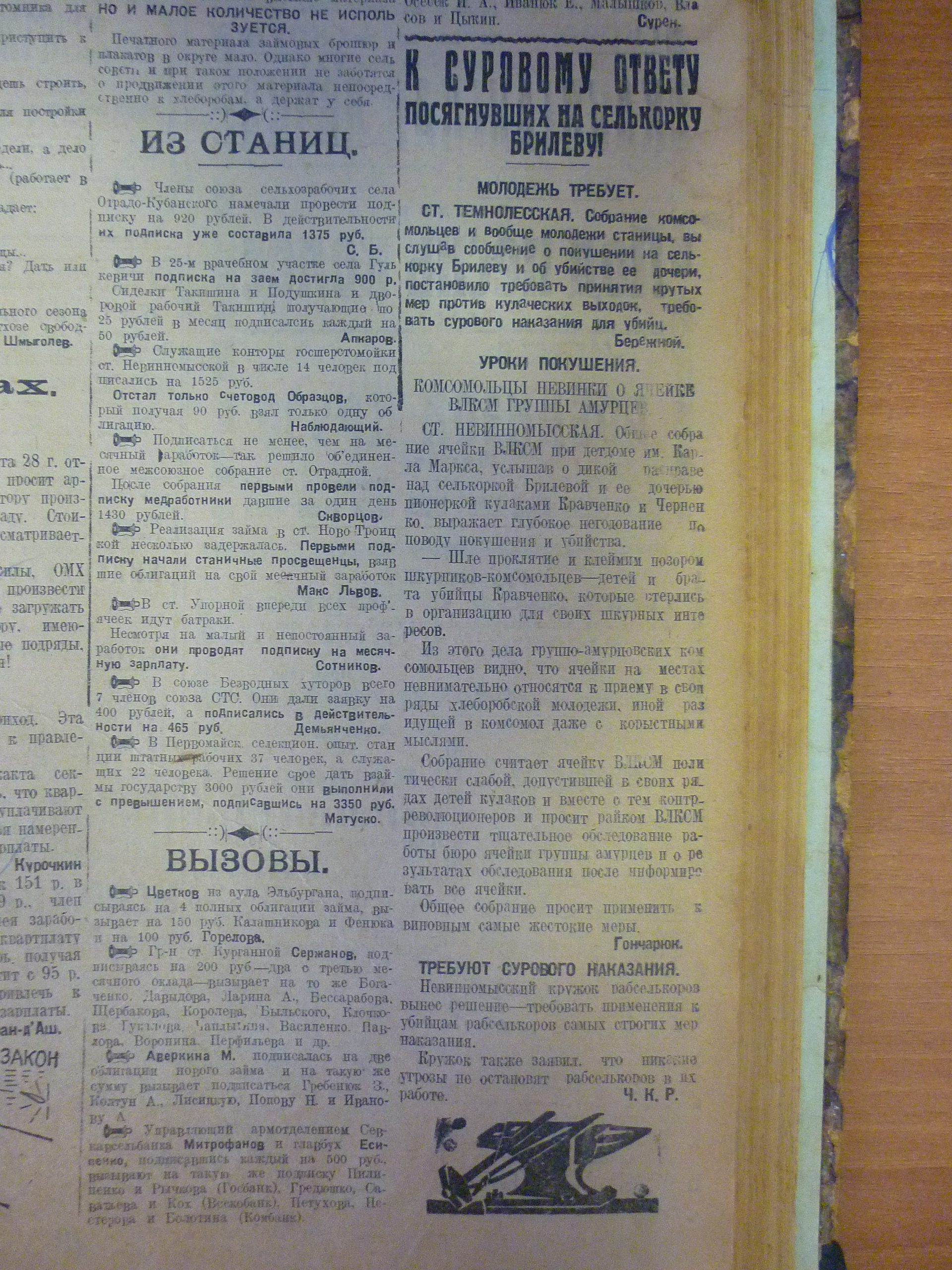 Бóльшая часть публикаций по делу Брилевой в «Трудовом пути» – заметки с мест, которые стали появляться на страницах газеты буквально через день после сообщения о начале следствия. В основном, это были резолюции собраний, прошедших в трудовых коллективах и по месту жительства, а также письма селькоров. Их общий настрой передают заголовки: «К суровому ответу посягнувших на селькорку Брилеву!», «Требуем беспощадного суда», «Выстрелы нас не остановят». Они печатались вплоть до суда и даже в первый день судебного процесса было несколько сообщений, в которых делегатки станицы Прочноокопской, селькоры Ново-Михайловского сельского кружка и домохозяйки жилищно-арендных кооперативных товариществ города требовали сурового приговора.