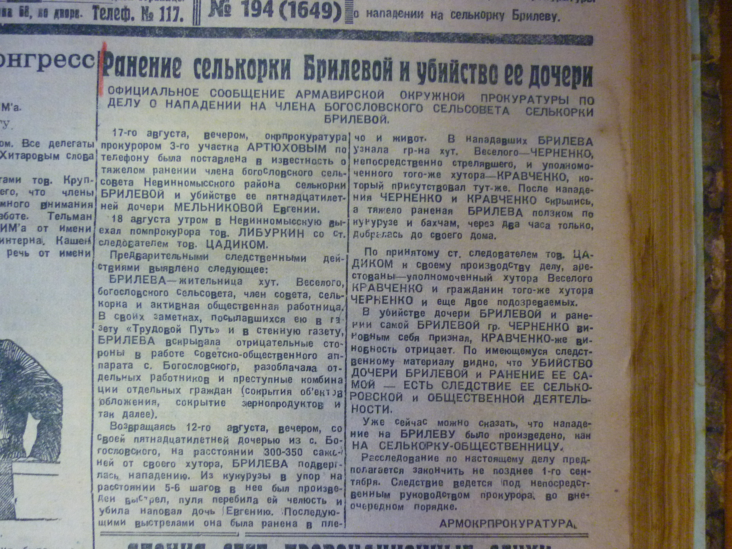 В газете за 6 сентября с подзаголовком «По материалам следствия» напечатана большая статья «Выстрелы в селькорку-общественницу Брилеву».
