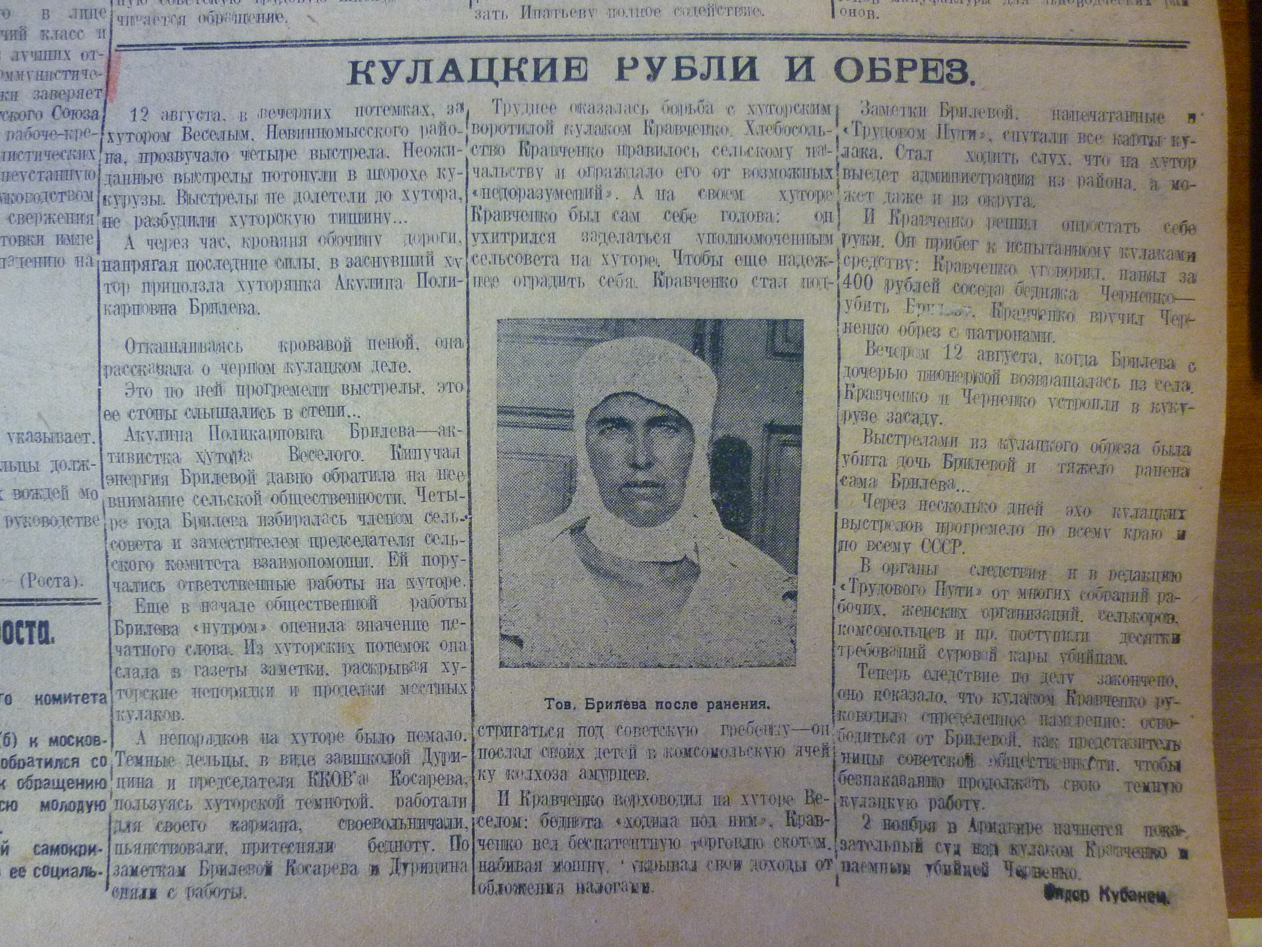 Кулацкие рубли и обрез : [покушение на общественницу Акулину Брилеву и убийство ее дочери] / Сидор Кубанец // Трудовой путь. – 1928. – 30 окт. – С. 1.