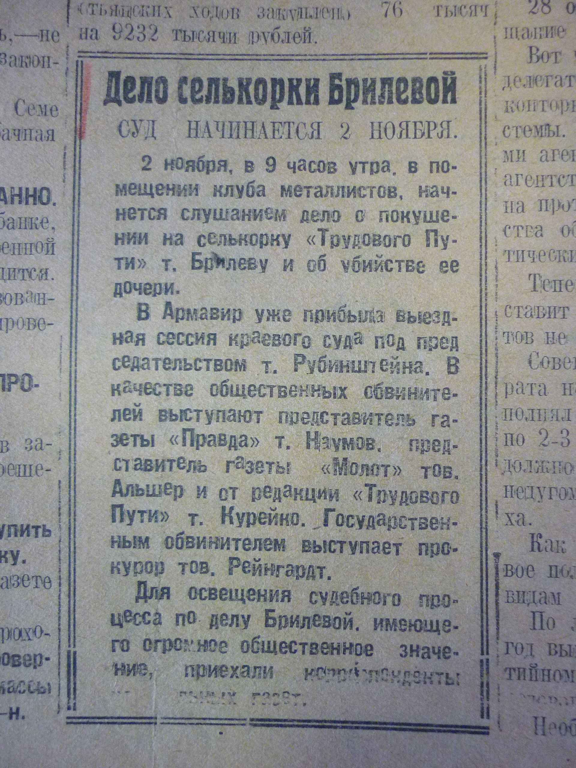«2 ноября, в 9 часов утра, в помещении клуба металлистов,12 начнется слушанием дело о покушении на селькорку «Трудового пути» т. Брилеву и об убийстве ее дочери.
